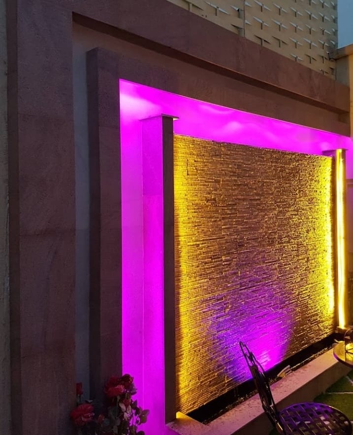 وتُعد الإضاءة عنصرًا مكملًا في تصميم الشلالات، حيث تضفي لمسة جمالية خاصة في فترات المساء، وتبرز حركة المياه وانعكاساتها بطريقة فنية جذابة. ويمكن استخدام الإضاءة الملونة أو البيضاء الهادئة بحسب طبيعة المكان والغرض من التصميم. كما تساهم الإضاءة في إبراز التفاصيل الدقيقة للصخور والنباتات المحيطة، مما يعزز من جاذبية المشهد العام.